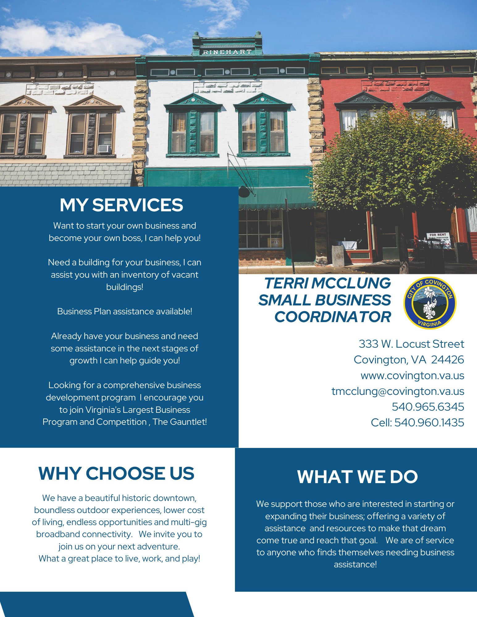 Terri recently took a position with the City of Covington as Small Business Coordinator where she will continue to assist anyone who would like to start up a business, locate a building, or expand their business within the city. She offers free assistance to someone who would like to make that dream come true and reach that goal of owning your own business.